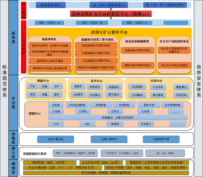 第七条 【透明矿山管控平台】基于统一数据标准、工业互联网架构,采用“云边协同”模式部署,集成各业务系统数据及感知层数据,运用新一代信息技术建设技术中台、数据中台和应用中台,为上层业务应用提供统一的数据汇聚与技术支撑,构建“透明化、可视化、一体化”管控模式,实现矿井隐蔽致灾数据共享服务与智能协同一体化管控。透明矿山建设的参考图1技术架构。