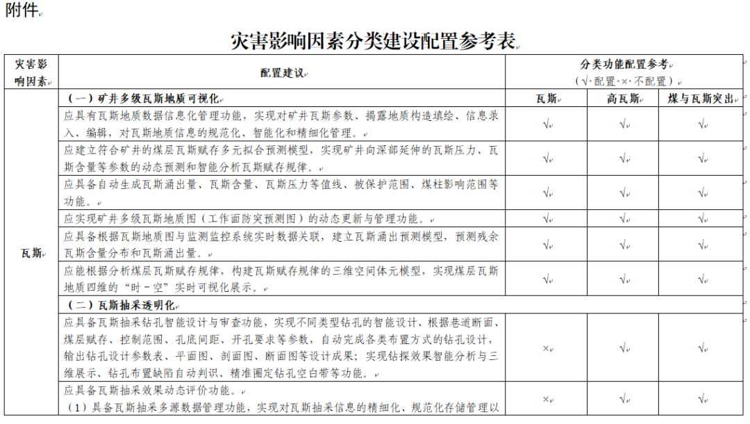 构建“隐蔽致灾因素探测/监测+三维地质模型”可视化模式,实现煤矿瓦斯、水害、火区、顶板及矿压等重点灾害地质因素的空间位置、几何特征和属性特征的可视化、预测与预警。详见附件灾害影响因素分类建设配置参考表。