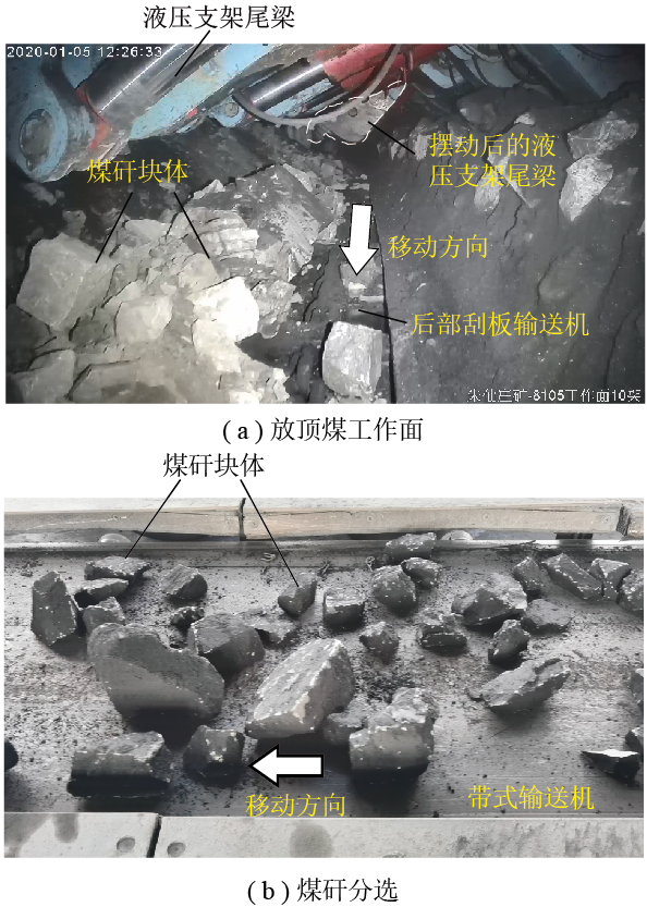 综采工作面和放顶煤工作面的区别主要在于放煤。煤炭开采过程中主要涉及到两类煤矸识别问题,一是综采工作面采煤机割煤过程中的煤岩界面识别,二是综放工作面放煤过程中的煤矸识别。前者已经在智能综采工作面初步实现,而后者要对后部刮板运输机上快速运动的、呈堆积状态的煤矸进行识别,目前仍然存在许多技术难题。目前,放顶煤工作面仍普遍采用人工放煤方式,放煤工人从液压支架间隙观察后部刮板运输机上煤流,观察矸石是否被放出或者放出的量,进而决定是否停止放煤。这种方法劳动强度大、生产效率低,且容易出现由于工人主观原因发生误操作的情况。