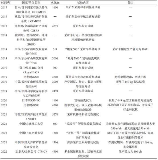 俄罗斯、欧盟、日本、印度、韩国等国均开展了采矿车海试及海底导航、行走、采集试验,韩国、俄罗斯等国还完成了输送系统海试。苏联莫斯科地质勘探学院于1990年开展水力提升系统海试,水深为79m。2009年,韩国地质资源研究院完成100m水深输送系统海试。2015年,韩国海洋科学技术院(KIOST)和海洋工程研究所(KRISO)进行了1200m水深的水力提升试验。2020年,日本石油天然气金属矿产资源机构研制的采矿车在水深1600m处完成了富钴结壳试采。2021年,比利时GSR公司在水深4500m处完成了履带式采矿车行走试验。同年,印度国家海洋技术研究所(NIOT)在水深5270m处完成了采矿机移动和机动性测试,目前该机构正在建造6000m级载人潜水器“Matsya 6000”。