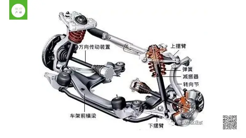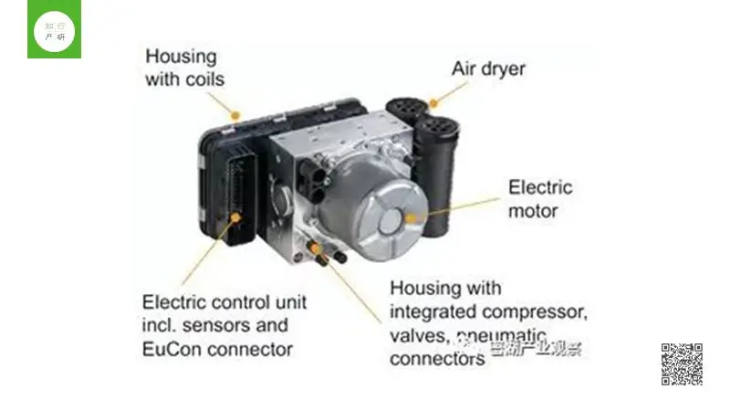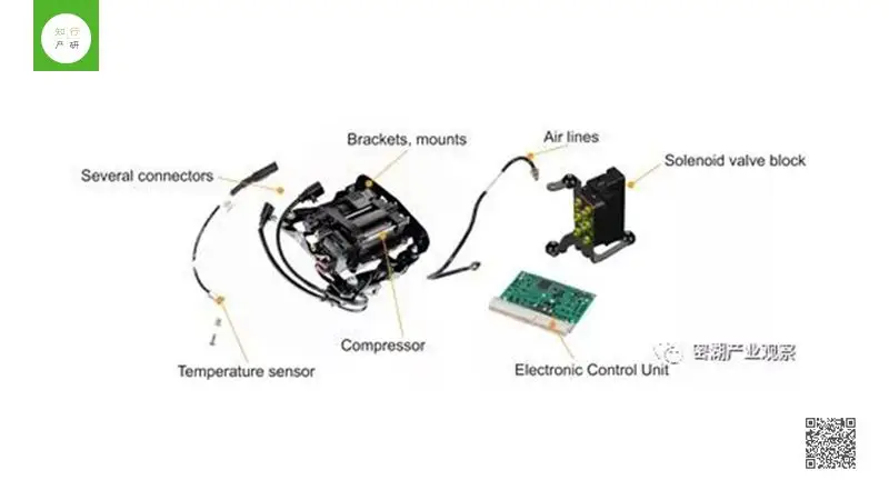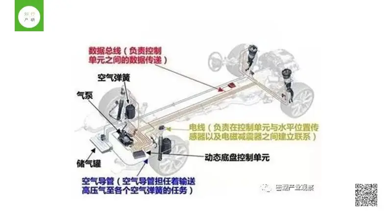 当前技术已经比较成熟,受限于成本目前绝大多数应用于高端车辆,与自动驾驶关系不大,行业格局稳定。组成部件主要有:空气弹簧、储气罐、高度传感器、减震器、气泵、电控单元。下面两图能够看到传统车辆的悬挂与空气悬挂的对比,可以看到相对传统悬架,空气悬架增多了汽车电子的控制系统。