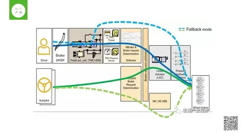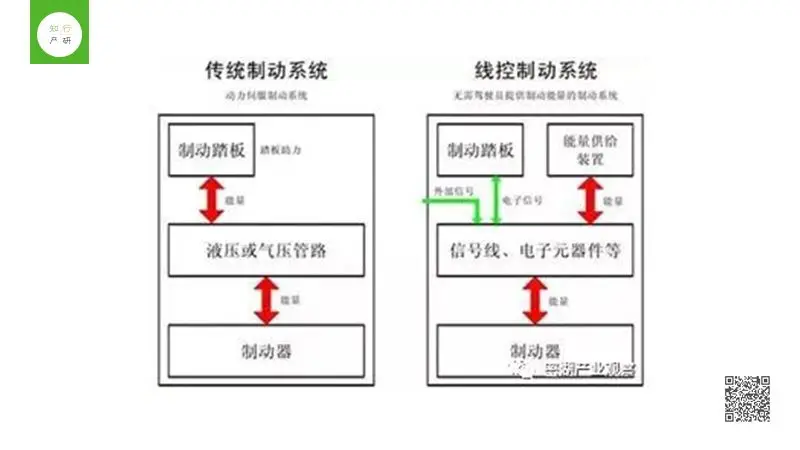 线控制动系统是在传统的制动系统上发展而来的,下两图可以看到线控制动系统和传统制动系统的对比。线控制动系统执行信息由电信号传递,相对来讲制动压力相应的更快,进而刹车距离更短更安全,车辆操控性更好。